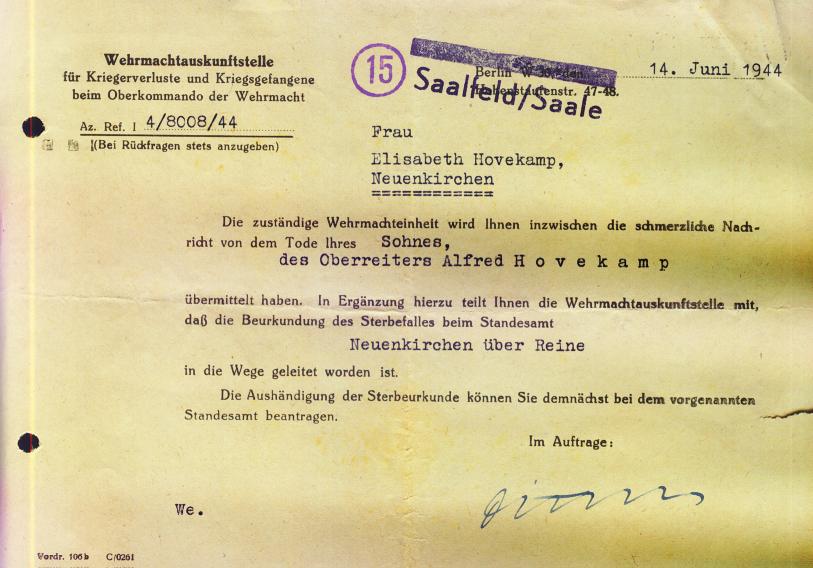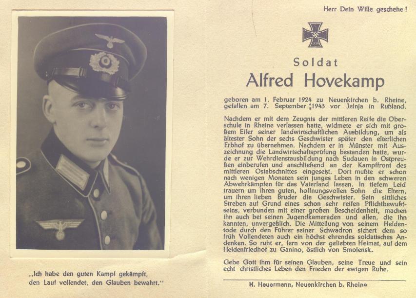 Ende des Jahres 1942 musste Alfred Hovekamp als Soldat in die Armee eintreten
