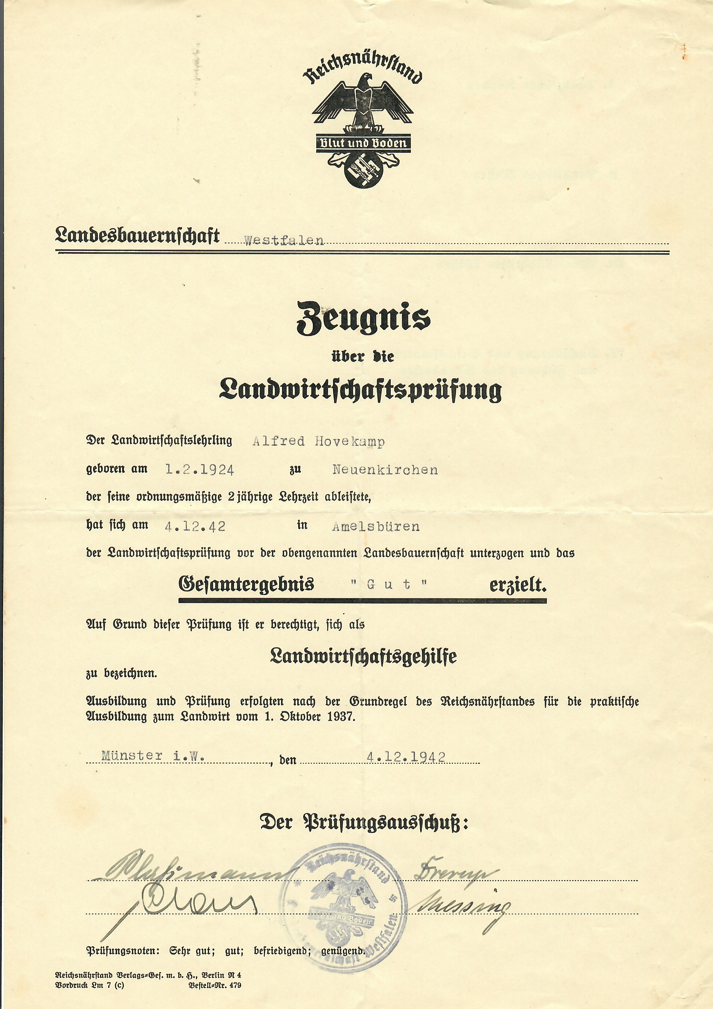 Abschluss der Landwirtschaftsschule am 5. Dezember 1942