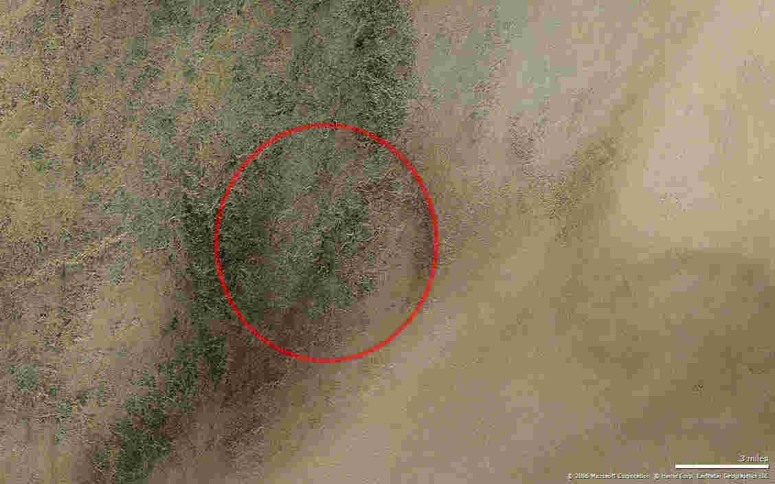 Diese ringförmige Struktur hat einen Durchmesser von etwa 11 km und liegt 50 km südwestlich von Arkenu 2 in der Sahara.