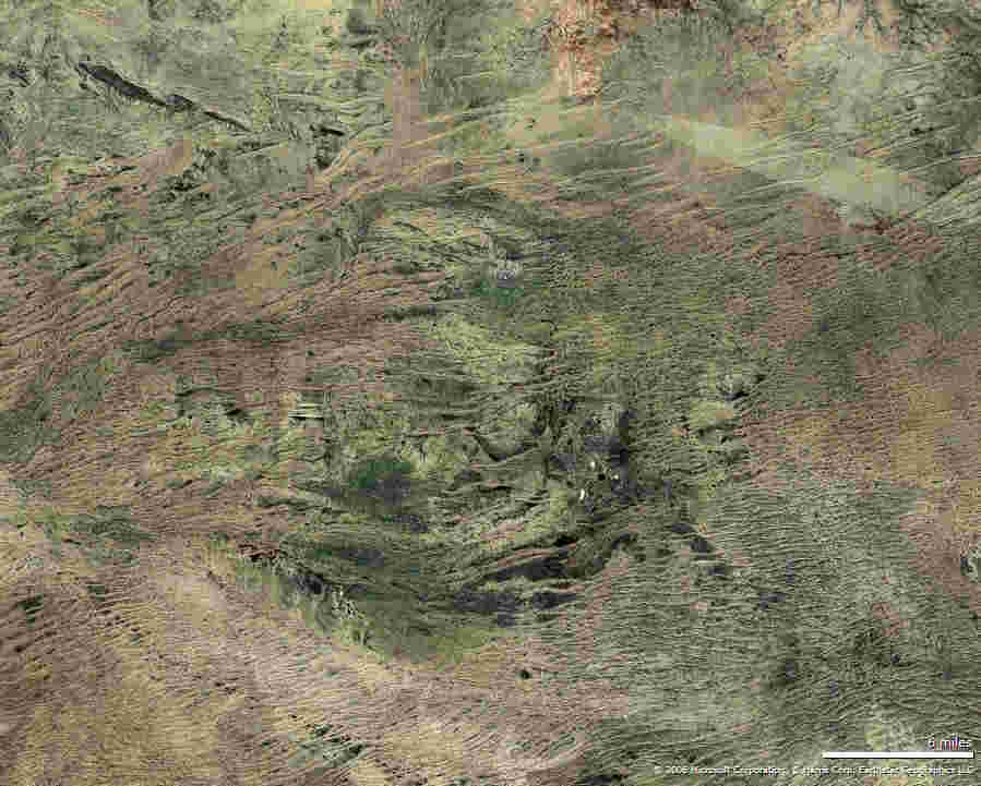 Auf den Satellitenbildern erscheinen zwei dunkelgrüne konzentrische Ringe und ein dunkelgrünes Zentrum.