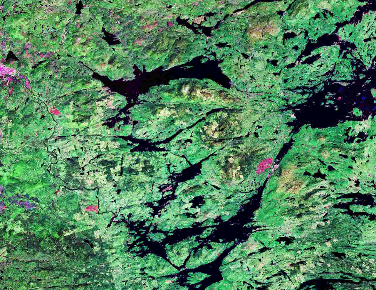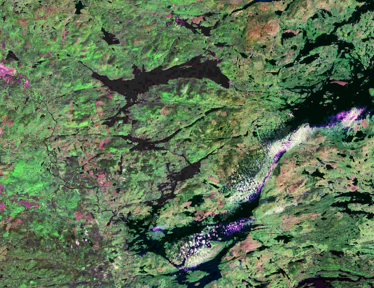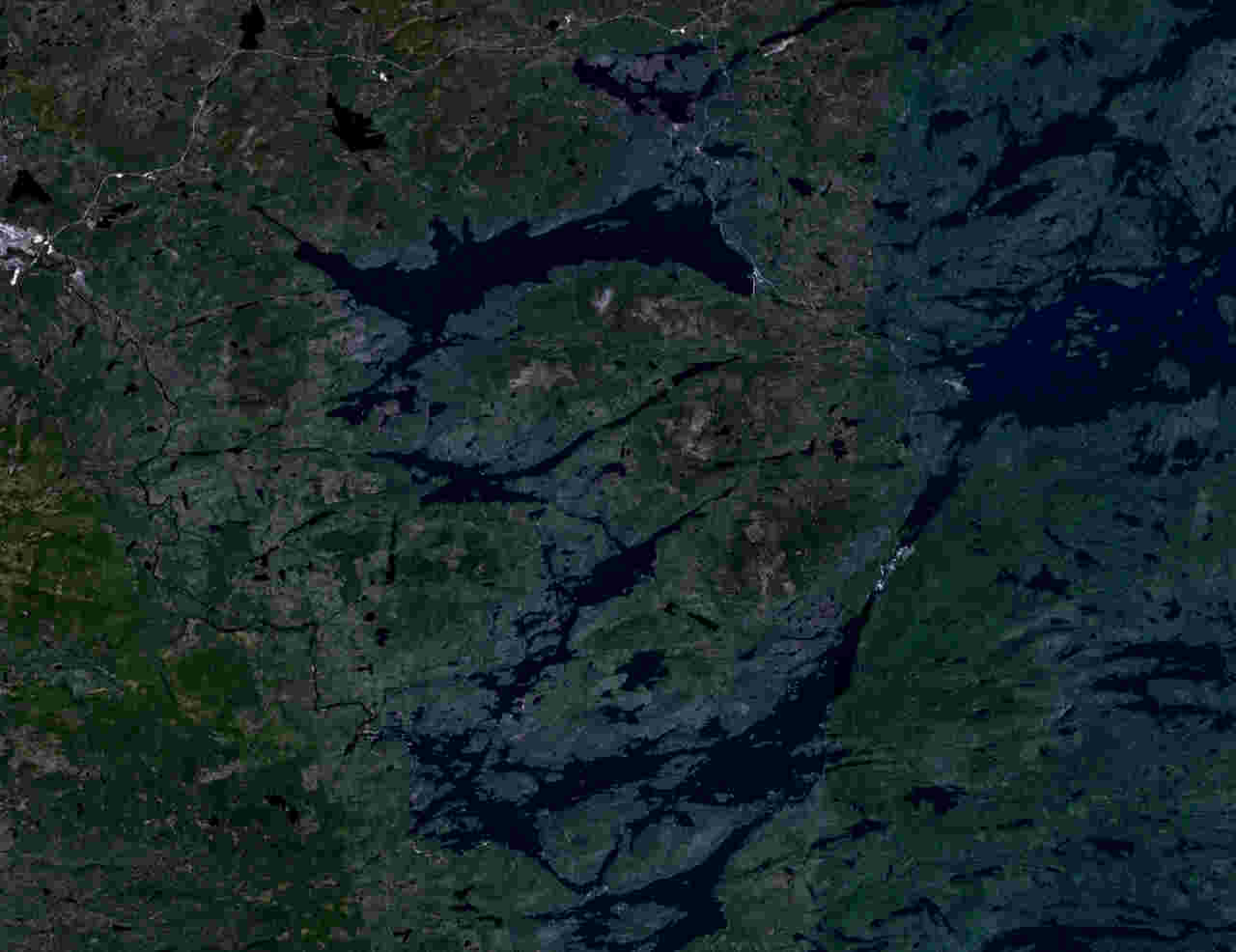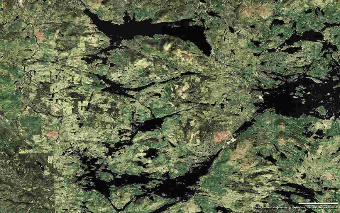 Auffällig sind hier zwei halbkreisförmige Seen auf der nördlichen und südlichen Seite.