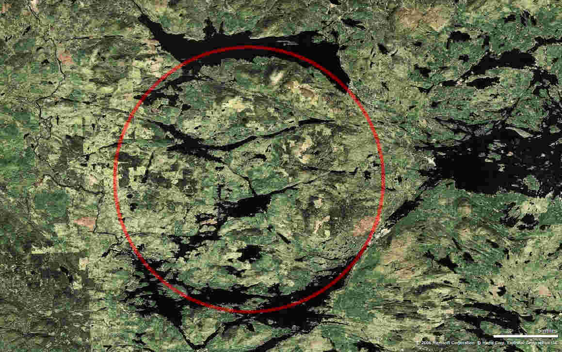 Diese Struktur hat einen Durchmesser von etwa 32 km und liegt auf der Halbinsel Kola.