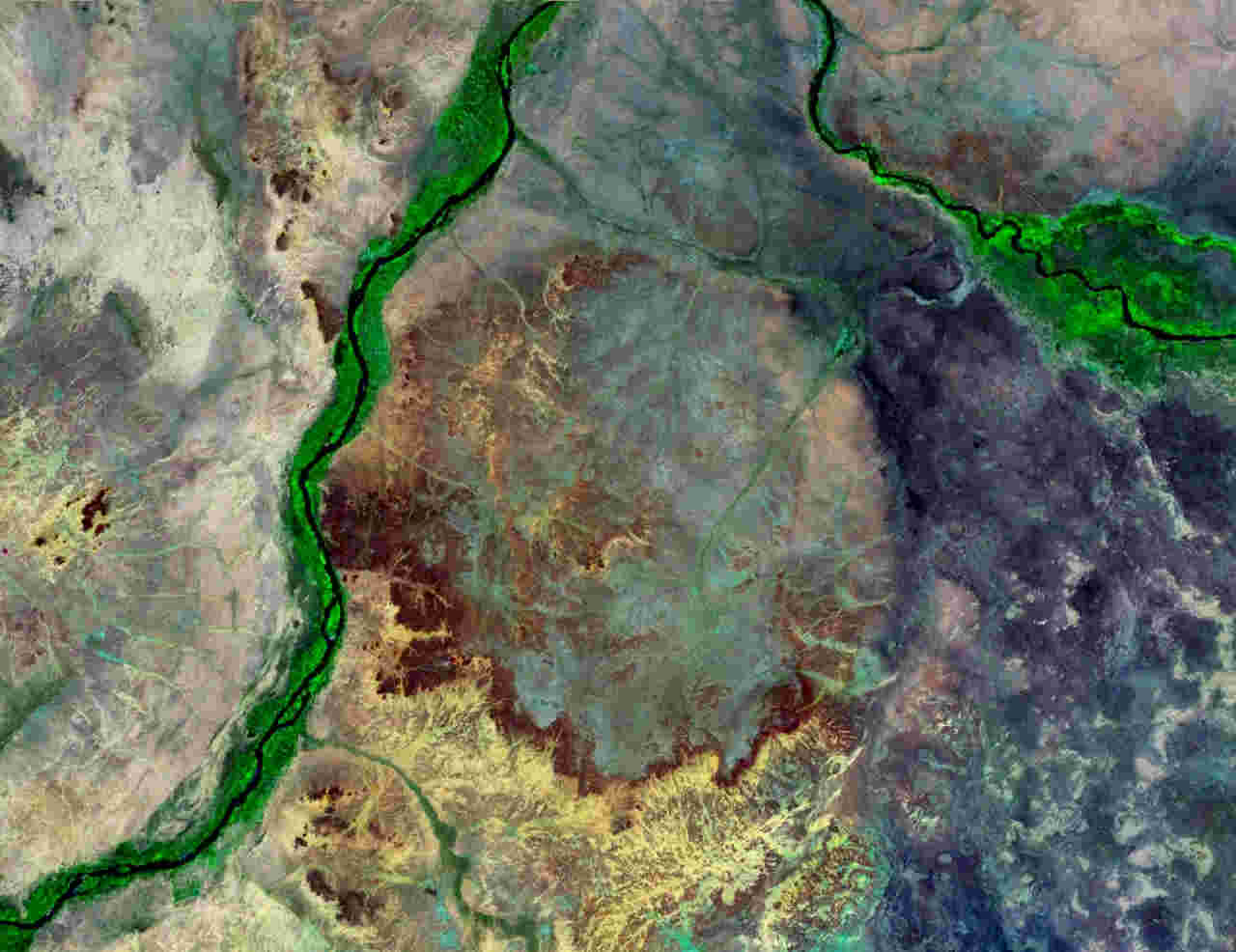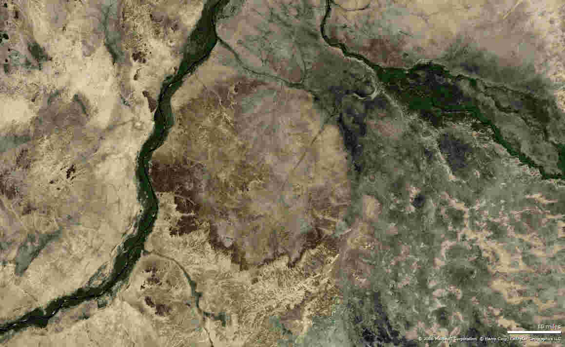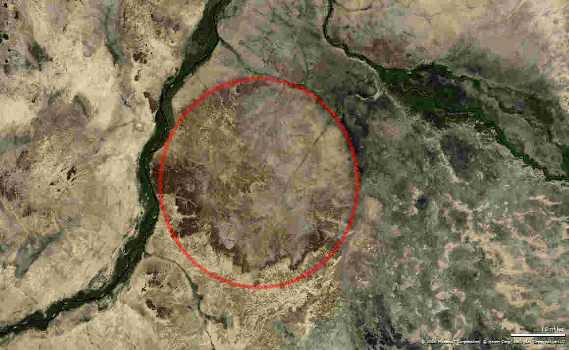 Die Struktur hat etwa 60 km Durchmesser und liegt direkt östlich des Nil.