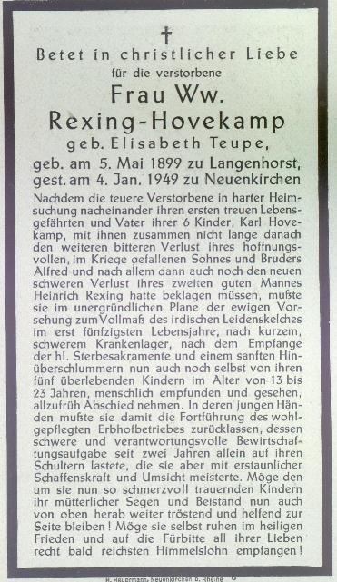 Maria, Elisabeth, Franziska Rexing, verw. Hovekamp, geb. Teupe