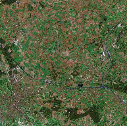 Im Süden fließt die Ems mäandrierend und setzt den großen Bogen fort, der dann im südwestlichen Teil (blaue Flecken) die Stadt Rheine durchquert.