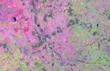 Im südöstlichen Teil schließt eine bogenförmige Waldfläche (grüne Flecken) an.