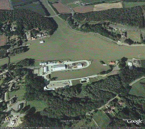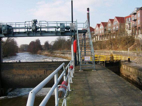 Stadt Rheine (rechte Emsseite flussabwärts) im Bereich des Emswehres und der Schleuse, auf der rechten Seite Häuser, die auf dem gewachsenen Kalkgestein erbaut sind.