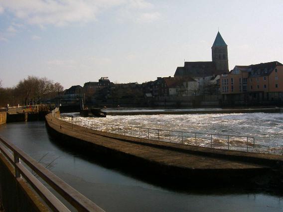 Stadt Rheine (linke Emsseite flussaufwärts) im Bereich des Emswehres (an der ehemaligen Furt) und der Schleuse, im Hintergrund die Stadtkirche die auf dem Kalksporn gegründet ist.