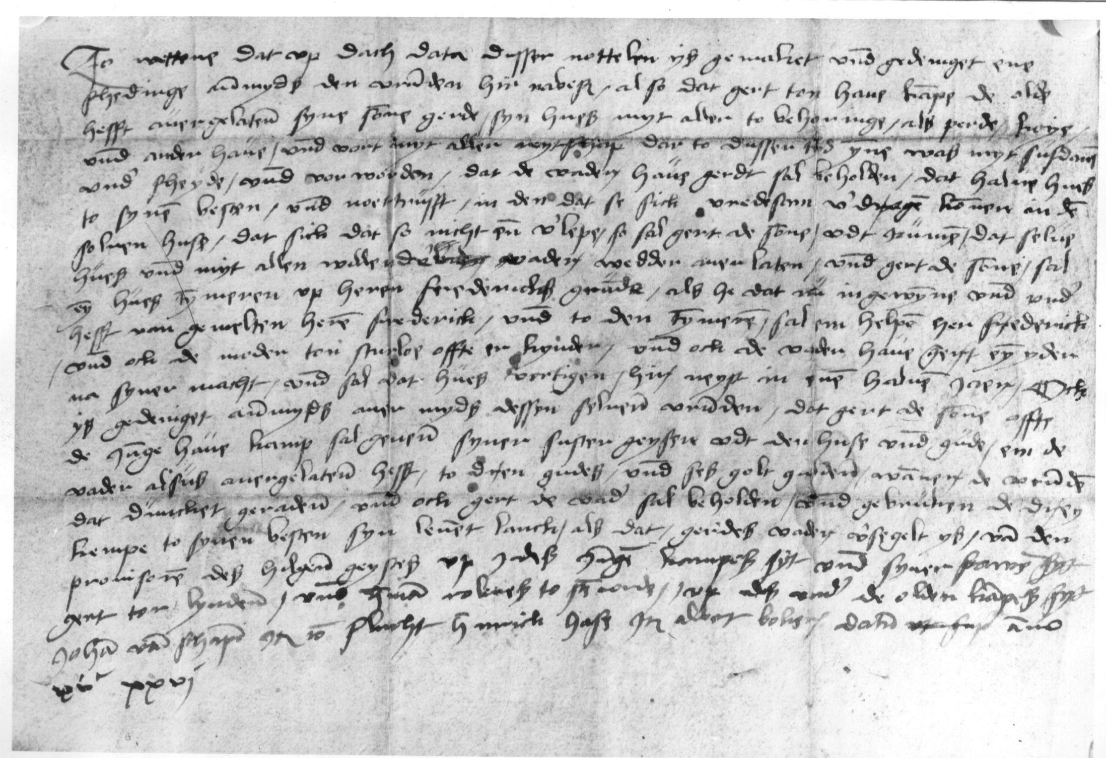 Man möge wissen, daß am Tage der Ausstellung dieser Urkunde eine Schichtung aufgerichtet worden ist unter Mitwirkung der untenbezeichneten Freunde, daß nämlich der alte Gert zum Havekamp seinem Sohne Gert sein Haus mit aller zubehörrung wie Pferden, Kühen und anderer Habe und aller Gerätschaft, die zu dieser Zeit darin sich findet, überlassen hat, jedoch mit dem Untetschied und Vorbehalt,' daß der Vater Havekamp zu seinem Besten und seiner' Notdurft das halbe Haus behalten soll; sie sollen sich in demselben Hause friedlich vertragen. Sollte das nicht eintreten, so soll der Sohn Gert das Haus räumen und dem Vater wieder überlassen. Dann soll Gert der Sohn ein Haus zimmern auf dem Grunde des Herrn Friedrich, den er zur Zeit von dem Herrn Friedrich unterhat. Bei dem Bau soll ihm helfen Herr Friedrich und die Mutter ton Sturlo oder deren Kinder und auch der Vater Have Gert, jeder nach seinen Kräften, und es soll das Haus innerhalb eines halben Jahres fertig sein. Es ist ferner ausgemacht, daß der Sohn Gert oder der junge Havekamp seiner Schwester Geyse aus dem Hause und Gute, das ihm der Vater überlassen hat, zu 3 guten (?) und 6 Gold-gulden geben soll, wann es den Freunden gut scheint. Auch soll Gert der Vater zu seinem Besten 3 Kämpe behalten auf Lebenszeit wie das Gerts Vater versiegelt ist von den Provisoren ( Vorstehern, Verwaltern) des Hospitals zum hl. Geiste. Zeugen auf seiten des jungen Kampes und seiner Frau waren Gert zur Linde und Hermann Roleves zu Stade (?); auf des Vaters Seite Johann von Schapen. ferner Johan Plucht, Heinrich Hase, ferner Albert Boker. Gegeben im Jahre 1526.